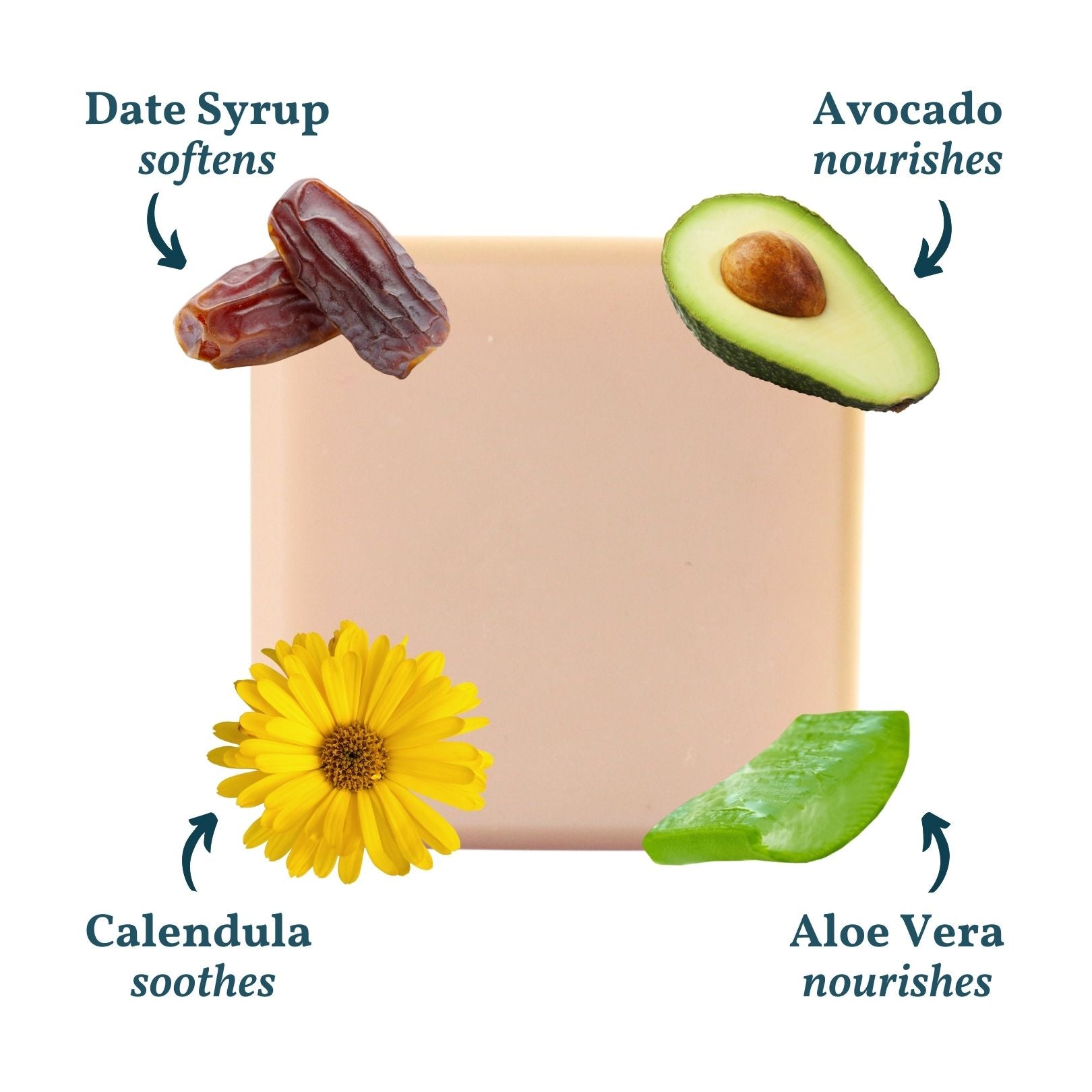 Inneholder: Ringblomst, ringblomst, aloe vera, avokado, dadelsirup, probiotika (symbiose av 19 mikroorganismer) [uten eteriske oljer]