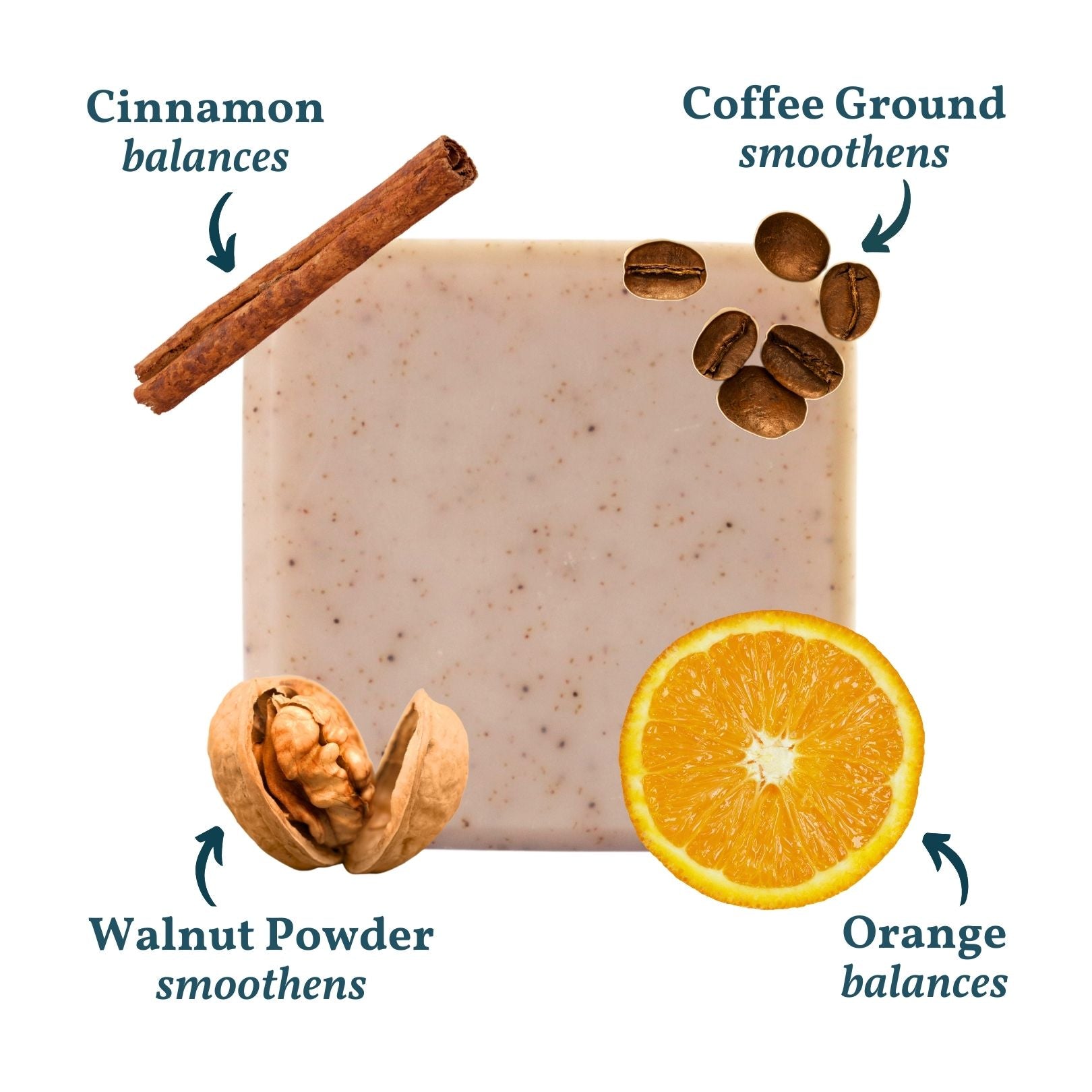 Inneholder: kaffegrut, valnøttskallpulver, kanelolje, appelsinolje probiotika