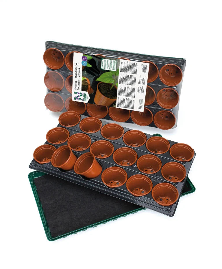 Enkelt omplantingssett bestående av bunntrau, vanningsmatte, og pottebrett med 18 potter (Ø 9 cm). Med jevn vanning fra undersiden utvikles plantenes røtter bedre.