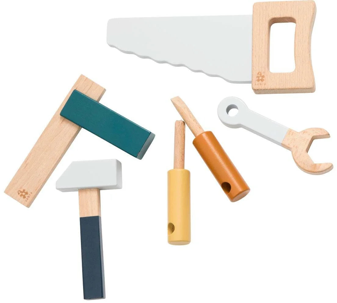 Et verktøysett fra Sebra, med seks forskjellige lekeverktøy. Passer supert sammen med verktøybenken - flott leke for den lille snekkeren!